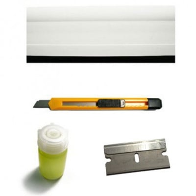 Montage-Set für Folien: Enthält Rakel, Montageflüssigkeit, Messer und Glasschaber-Klinge für professionelle Ergebnisse.