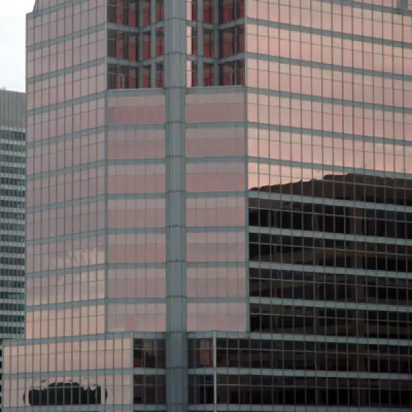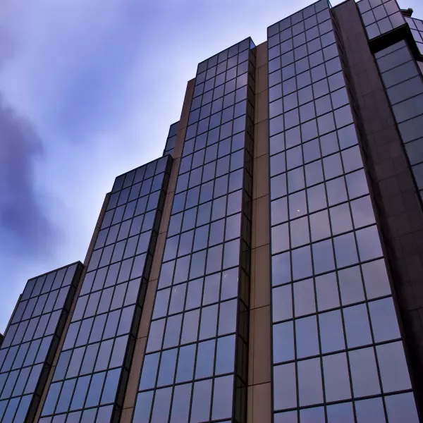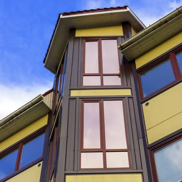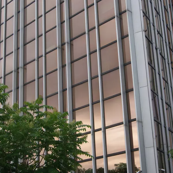 Eine dunkel getönte Sonnenschutzfolie zur Innenmontage bietet hohen Schutz vor Sonne, Blendung, UV-Strahlen und Hitze. Von außen erzeugt sie einen intensiven kupferfarbenen Spiegeleffekt, der tagsüber einen wirksamen Sichtschutz nach innen ermöglicht.
