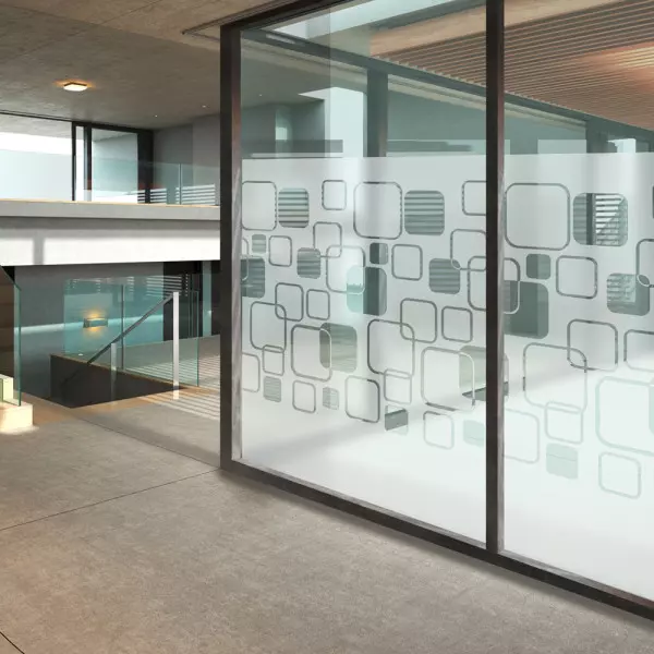 Eine originelle Innenfolie mit unterschiedlich großen transparenten Quadraten wertet Glaswände in Konferenzräumen oder Wohnzimmern dekorativ auf und lenkt Einblicke geschickt ab.