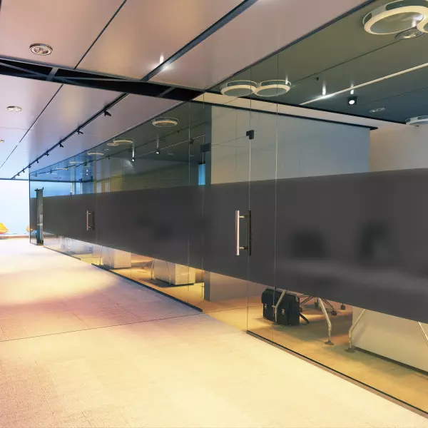 Eine matt grau getönte Sichtschutzfolie zur Innenmontage bietet effektiven Sicht- und Blendschutz und schützt die Privatsphäre in Umkleiden, Badezimmern oder Meetingräumen. Sie ist opaleszierend, aber lichtdurchlässig.