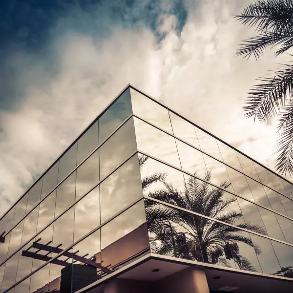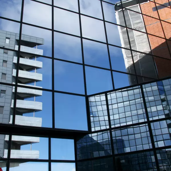 Eine dunkel getönte Sonnenschutzfolie zur Außenmontage bietet extremen Schutz vor Sonne, Blendung, UV-Strahlen und Hitze. Sie erzeugt einen kräftigen silberfarbenen Spiegeleffekt außen und einen anthrazitfarbenen Effekt innen, wodurch tagsüber ein hervorragender Sichtschutz nach innen gewährleistet wird.