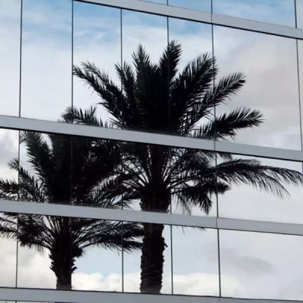 Eine dunkel getönte Sonnenschutzfolie zur Innenmontage bietet effektiven Schutz vor Sonne, Blendung, UV-Strahlen und Hitze. Außen erzeugt sie einen kräftigen silberfarbenen Spiegeleffekt, während innen ein anthrazitfarbener Effekt entsteht, der tagsüber einen guten Sichtschutz gewährleistet.