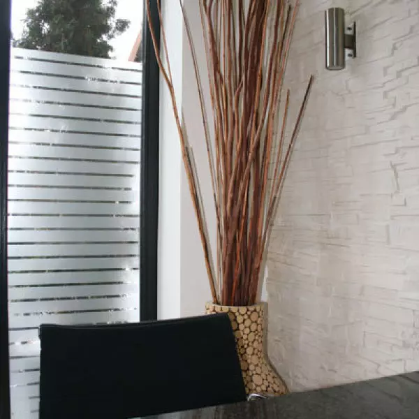 Eine matt weiß gestreifte Innenfolie für Verglasungen eignet sich ideal für Empfangs- und Wartebereiche, Konferenzräume und Trennwände und reduziert die Einsicht von außen.